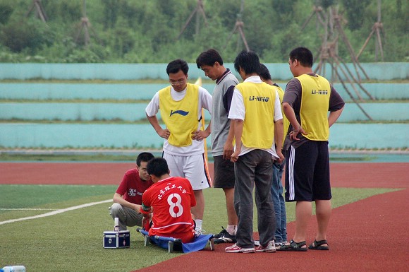 场上队长8号袁微被对方铲伤后,在场边接受临时治疗。