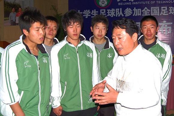 我校大学生足球队主教练金志扬与队员们在一起。