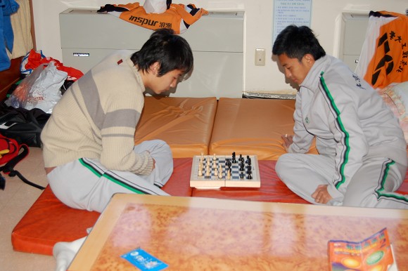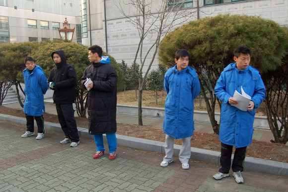 队员们在就餐前和训练之余不忘学习,大都随手带着课本。