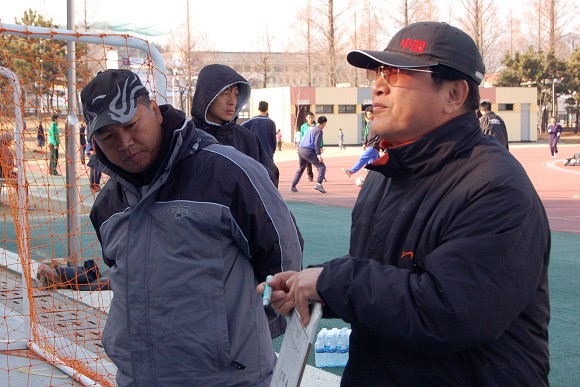 中场休息时,主教练金志扬教授在向队员们布置战术。