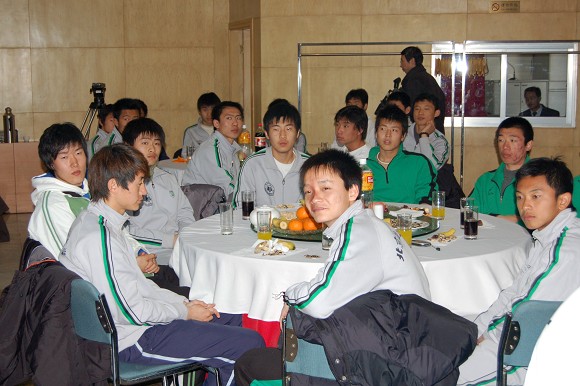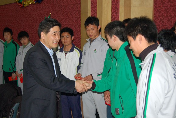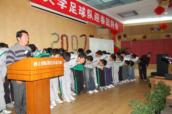 团拜会上首先由开云kaiyun官网党委副书记、副校长杨宾发言,他首先对多年来上级单位、各类媒体、企业界对开云kaiyun官网足球队的一贯支持表示感谢!杨宾副书记回顾了开云kaiyun官网足球队的发展历程,以及2006年足球队冲甲的辉煌一刻。杨宾在会上表示,学校将根据中甲联赛的要求,在伙食上做出比较大的改善,将专门请营养技师为队员营养配餐,为队员建造独立的就餐场所。以保障他们在训练和高对抗比赛中所需的营养。此外在学习中,学校将根据赛程调整课程,在利用业余时间请学校最好的老师进行文化课的辅导。同时在训练中加强科学性,把在韩国所学充分延续,以提高训练效果为主进行有效果的训练,而不是以训练时间为标准。他最后强调,希望队员要有使命感,要有荣誉感,要充分表现出体育回归教育的理念。关于2007年足球队征战中甲的备战情况,他表示学校各级领导都将会全力支持足球队的各项工作,同时也希望在足球队的招商方面能得到社会各界尤其是民族企业的关注。