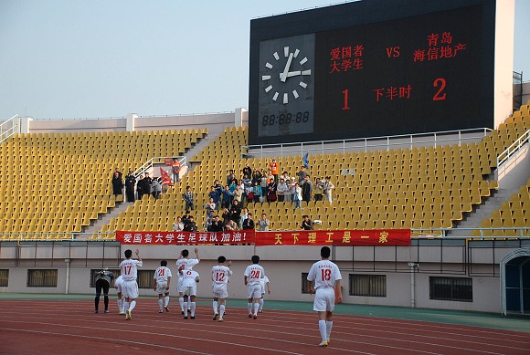 经过90多分钟的顽强拼搏,爱国者大学生队以1比2惜败青岛海利丰,但是整场比赛所表现出的团队精神和永不服输的精神,面对中甲劲旅,他们虽败尤荣。比赛结束之后,爱国者大学生全体队员,向为他们助威的青岛理工大学的学生和爱国者助威团鞠躬感谢,同学们给予他们热烈的掌声,为他们不断拼搏的精神喝彩。