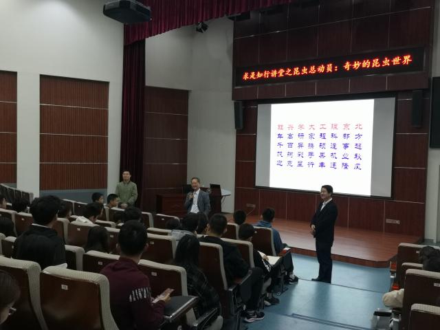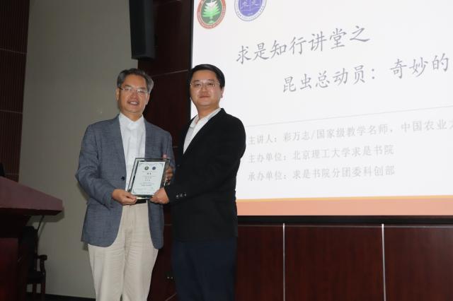 10月14日晚,北理工求是书院知行讲堂第四期在良乡校区综合教学楼报告厅举行。国家杰出青年科学基金获得者,享受政府特殊津贴人员,国家级教学名师,中国农业大学植保学院副院长彩万志教授带来题为“奇妙的昆虫世界”的专题报告。求是书院专职副院长周芳集老师出席报告会并为彩万志教授颁发了求是书院校外导师聘书,来自求是书院的160余名同学聆听了报告会。报告会由求是书院团委书记、综合办公室主任张锋老师主持。