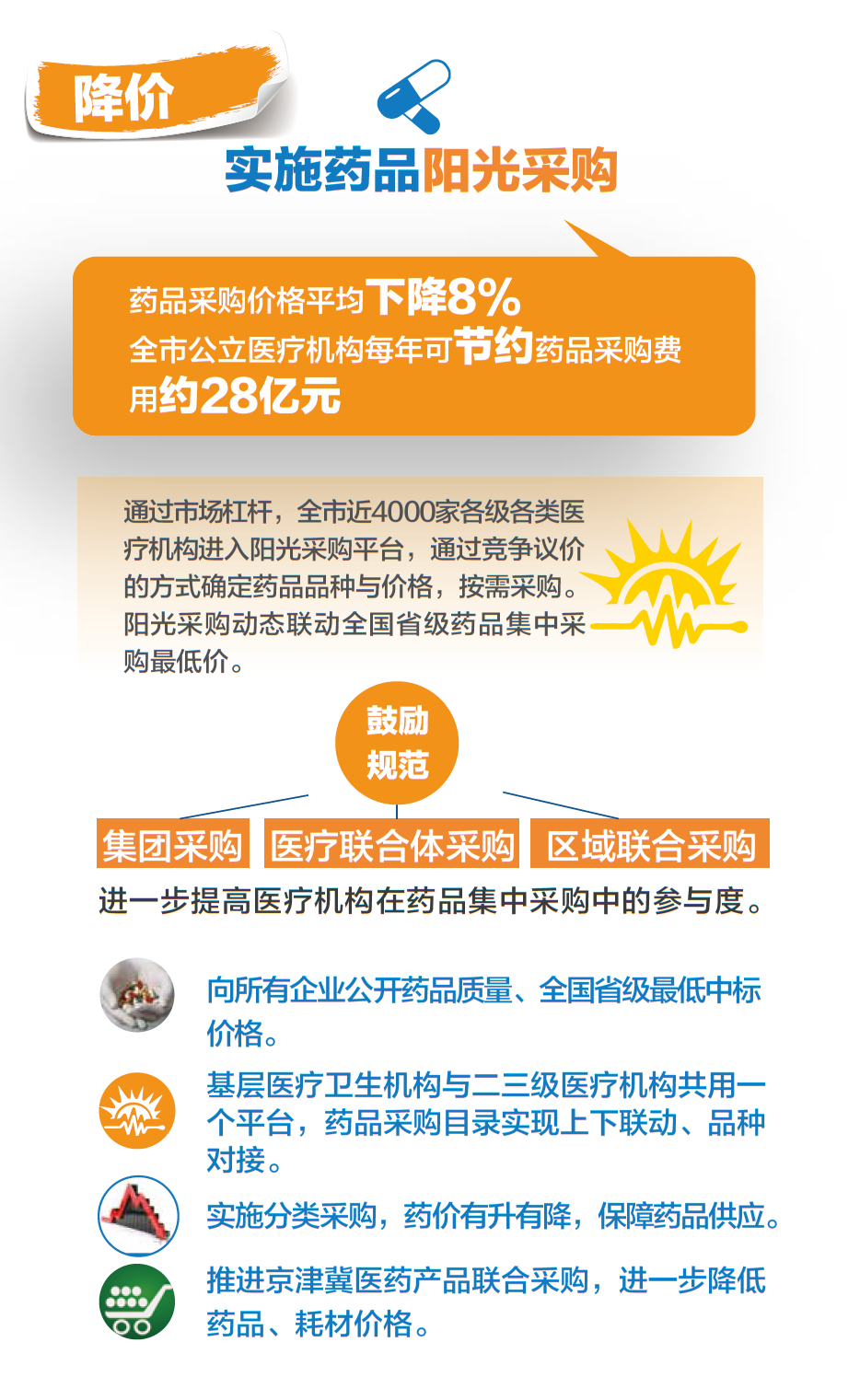 三是实施药品阳光采购。纳入阳光采购的药品在政府搭建的网上平台采购,大多数常用药品价格动态联动全国省级药品集中采购最低价,做到同品种同厂家的药品在保证质量不变的同时价格处于较低水平。此次阳光采购中,市属医院在保证质量安全和用药连续性基础上实施阳光采购,76%的药品与之前没有变化,保证对患者治疗的连续性。同时采购品种、价格、数量、变化等都在阳光下运行。