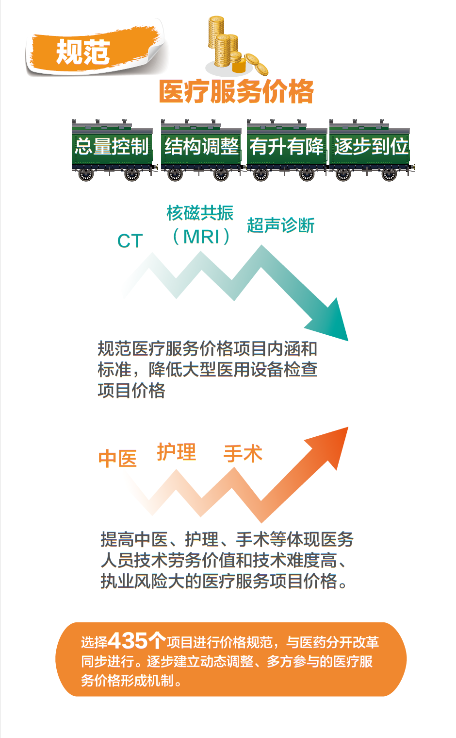 二是规范基本医疗服务项目,实施有升有降的调整。这次调整了435 项,有升有降,总体平衡。降的是CT、核磁等大型检查设备项目价格,升的是中医、护理、手术等体现医务人员技术劳务价值的项目价格。目的是提升医疗服务质量,引导医疗资源合理配置。