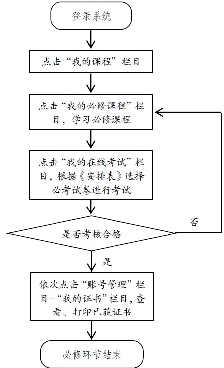 必修环节的操作流程见图2。学员打开资产与实验室管理处网站(http:/gbxxgk/gbgljg/sysysbglc/index.htm),点击“资产与实验室管理处网站”,进入学校“统一身份认证登录”页面,按页面右侧提示输入用户名和密码进入“资产与实验室综合管理平台”,点击“实验室安全教育与考试系统”进行操作。建议使用IE浏览器,需要启用activex插件,且不要阻止弹出窗口。