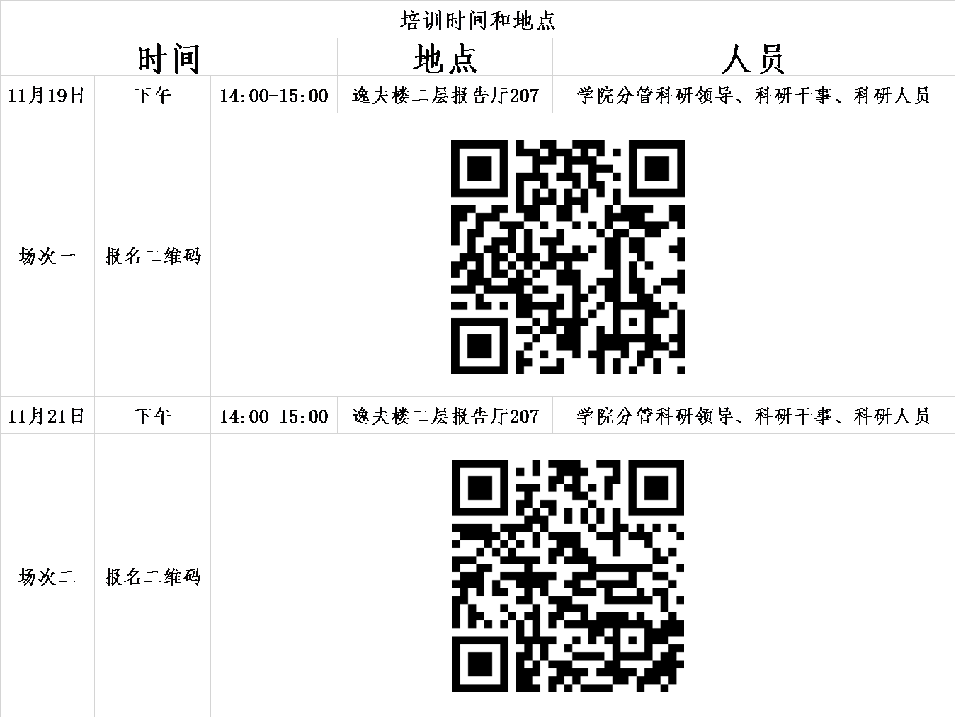 本次专题培训根据广大科研人员需求,分期分批举办多场次培训,近二期培训安排见附件。各位老师可直接扫码报名参加,报名截止时间为2019年11月14日下午16:00前。同时,科研院将根据各学院和单位的需求情况,有针对性的组织开展培训。