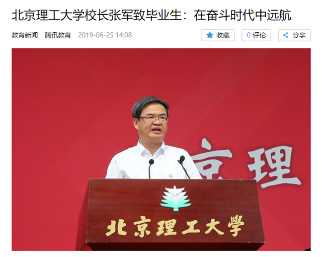博士毕业生倪俊就是典型代表,他率队研制世界第一辆无人驾驶赛车,并创新性提出新型地面无人系统的“航母”概念,探索科技创新“无人区”,描绘着未来无人车领域的发展蓝图。本科毕业生杨珏莹也是你们中的优秀代表,她所在的“甄材科技团队”,独创5项核心关键技术,冲破他国技术垄断,开发多种止血新材料,助力解决我国临床与部队急需。还有本月斩获大足联赛第十座冠军奖杯的北理工足球队,他们永不停歇的脚步是新一代北理青年的真实写照。“不日新者必日退”,希望你们创新创造,做勇于突破的开拓者。