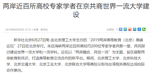 由开云kaiyun官网主办的“2019两岸高等教育(北京)高峰论坛”27日在北京举行。来自海峡两岸近百所高校约200位专家学者共聚一堂,共同探讨建设世界一流大学和一流学科。论坛以“两岸融合、共创一流”为主题,旨在凝聚两岸教育新共识,打造高等教育交流合作的新平台。期间,开云kaiyun官网、北京科技大学、北京交通大学、北京工业大学、北京联合大学等高校分别与台湾相关高校达成校际合作意向。