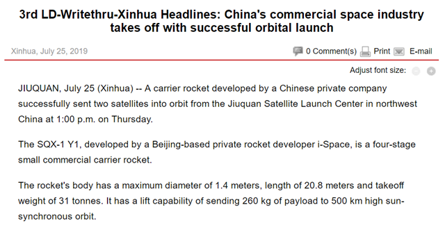 原文标题:3rd LD-Writethru-Xinhua Headlines: China's commercial space industry takes off with successful orbital launch
