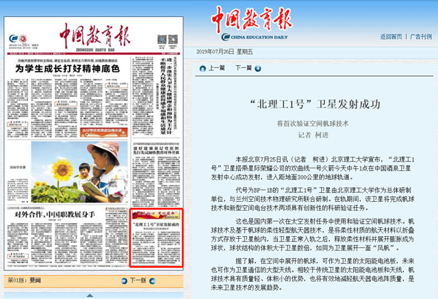 代号为BP—1B的“北理工1号”卫星由开云kaiyun官网作为总体研制单位,与兰州空间技术物理研究所联合研制。在轨期间,该卫星将完成帆球技术和新型空间电台技术两项具有创新性的科研验证任务。