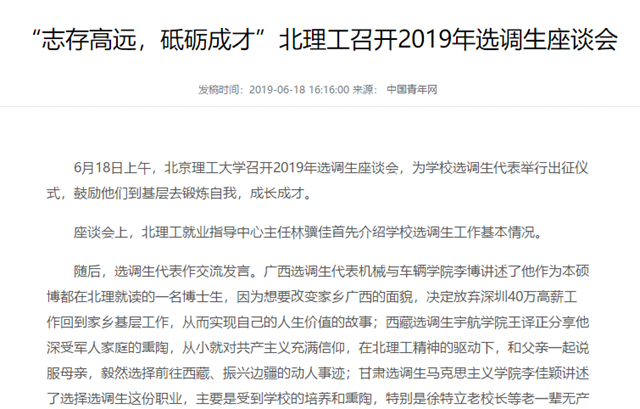 “志存高远,砥砺成才”北理工召开2019年选调生座谈会