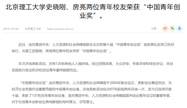 近日,由共青团中央、人力资源和社会保障部联合主办的第十届“中国青年创业奖”颁奖典礼在浙江杭州举行,北理工史晓刚、房亮两位青年校友荣获“中国青年创业奖”。