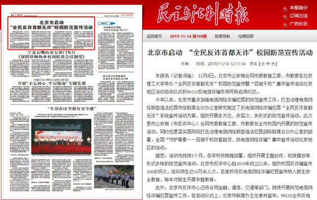 编辑:吴楠 审核:王征 阅读次数:原文标题:北京市启动 “全民反诈首都无诈”校园防范宣传活动