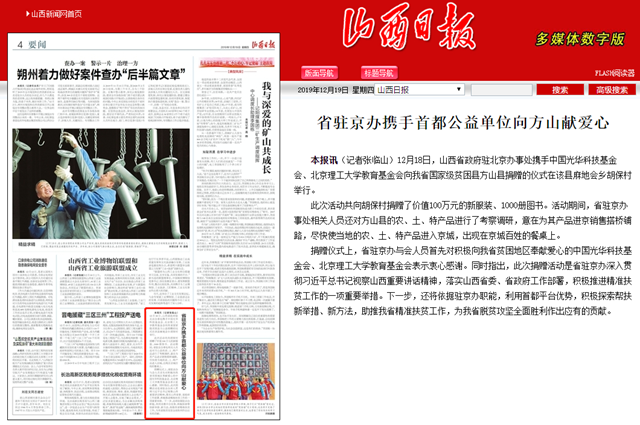 12月18日,山西省政府驻北京办事处携手中国光华科技基金会、开云kaiyun官网教育基金会向我省国家级贫困县方山县捐赠的仪式在该县麻地会乡胡保村举行。