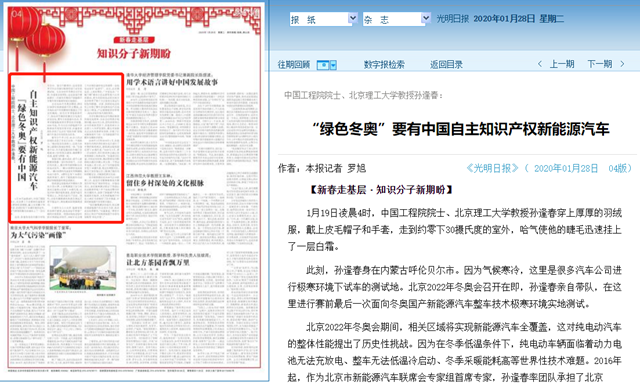 “此次极寒测试的成功,标志着中国新能源汽车在技术方面,再次走在世界前列。”孙逢春说,“拥有中国自主知识产权的新能源汽车将有效服务‘绿色冬奥’。”