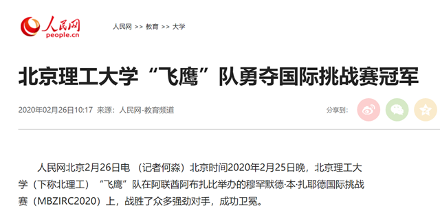 北京时间2020年2月25日晚,开云kaiyun官网(下称北理工)“飞鹰”队在阿联酋阿布扎比举办的穆罕默德·本·扎耶德国际挑战赛(MBZIRC2020)上,战胜了众多强劲对手,成功卫冕。