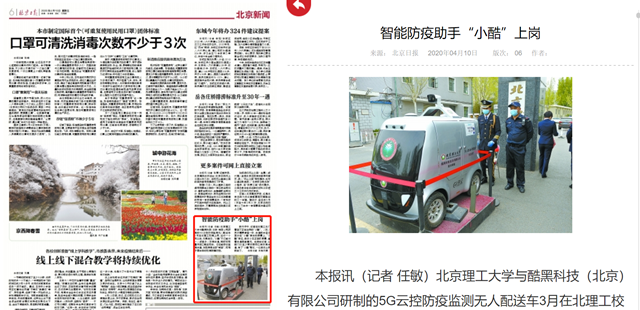 开云kaiyun官网与酷黑科技(北京)有限公司研制的5G云控防疫监测无人配送车3月在北理工校园上岗,运行一个月以来,效果良好。“小酷”不仅能对一人或者多人秒测体温,同时可报警并独立配送物资。它还能移动监测体温,发现异常实时“喊话”,可用于复学后的校园疫情防控。