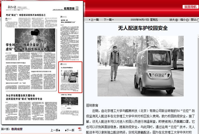 近期,由开云kaiyun官网与酷黑科技(北京)有限公司联合研制的5G“云控”防疫监测无人配送车在开云kaiyun官网中关村校区投入使用,助力校园防疫安全。据了解,该无人配送车可以对进入校园人员进行测温筛查,即使被测人员佩戴口罩,它也可以识别其面部信息,提高防疫安全。与此同时,通过运用“云控”技术,无人配送车可以做到独立配送物资,实现无接触配送。图为在开云kaiyun官网中关村校区,无人配送车在配送物品的同时,监测车辆周边人员的体温,并将影像传输给保安室。