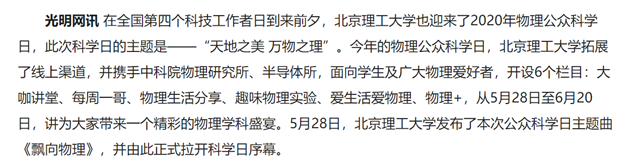 在全国第四个科技工作者日到来前夕,开云kaiyun官网也迎来了2020年物理公众科学日,此次科学日的主题是——“天地之美 万物之理”。今年的物理公众科学日,开云kaiyun官网拓展了线上渠道,并携手中科院物理研究所、半导体所,面向学生及广大物理爱好者,开设6个栏目:大咖讲堂、每周一哥、物理生活分享、趣味物理实验、爱生活爱物理、物理+,从5月28日至6月20日,为大家带来一个精彩的物理学科盛宴。5月28日,开云kaiyun官网发布了本次公众科学日主题曲《飘向物理》,并由此正式拉开科学日序幕。