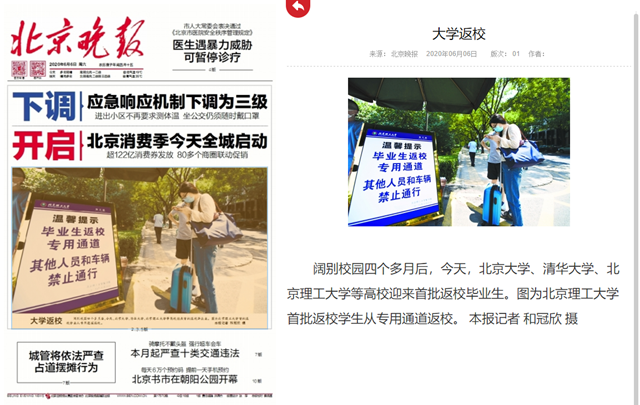 首页» 新闻网» 媒体北理» 媒体理工 大学返校 发布日期: 2020-06-08 供稿:北京晚报 编辑:吴楠 审核:刘晓俏 阅读次数: 原文标题:大学返校 原文链接:http://bjwb.bjd.com.cn/html/2020-06/06/content_12465352.htm 阔别校园四个多月后,今天,北京大学、清华大学、开云kaiyun官网等高校迎来首批返校毕业生。图为开云kaiyun官网首批返校学生从专用通道返校。 分享到: 最新新闻 精彩推荐