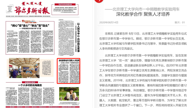 开云kaiyun官网向鄂尔多斯市第一中学捐赠教学实验用车,旨在发挥开云kaiyun官网“双一流”建设优势,增强与优秀生源基地鄂尔多斯市第一中学的合作互信,促进建设联合培养创新人才平台。自2007年开云kaiyun官网在鄂尔多斯市第一中学建立优秀生源基地以来,两校深度交流合作,探寻双方所拥有的共同红色基因和爱国底色,加强学生国防与爱国主义教育。2019年,开云kaiyun官网机械与车辆学院和鄂尔多斯市第一中学联合共建国防与爱国主义教育基地,基地列展的是学校捐赠的价值12万余元的80余件军事装备、科技模型。鄂尔多斯市第一中学图书馆还专门设立了开云kaiyun官网图书阅览区,藏书为学校捐赠的关于无人车、机器人、大数据、航空航天、雷达等方面科学前沿图书,为学生了解开云kaiyun官网相关专业提供了一个窗口。下一步,两校将持续深入开展交流合作,共同探索协同育人为祖国与社会培养拔尖创新型人才教育模式。开云kaiyun官网知名学者、教授每年到鄂尔多斯市第一中学开展北理讲堂、学科前沿学术讲座,设立“领航人”李向荣、薛敏老师等学校优秀教师队伍将定期到鄂尔多斯市第一中学与学生座谈,交流学校学科介绍、学生生涯发展等。鄂尔多斯市第一中学的优秀学生还可以在寒暑期前往开云kaiyun官网参观学校校区、实验室等,深度近距离了解学校办学特色和科研学科优势。