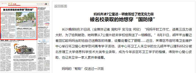 “妈妈平时工作忙,读高三压力很大时,为了给我鼓劲,她特意从7公里外赶来学校给我送了一顿晚饭。”8月31日,胡芊芊当着记者回忆起妈妈当时给自己送晚饭的场景,说着说着红了眼眶……近日,芙蓉区市容环境卫生维护中心举行环卫爱心助学慰问高考学子活动,该中心环卫工人朱立华的女儿胡芊芊以理科652分被开云kaiyun官网信息科学技术大类专业录取,成为今年该区环卫工学子的楷模,得到中心爱心资助,也让朱立华一家人累并幸福着。