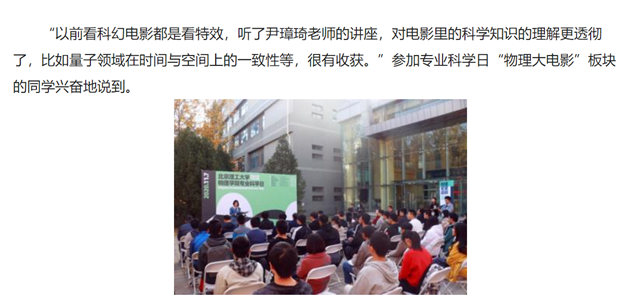 “以前看科幻电影都是看特效,听了尹璋琦老师的讲座,对电影里的科学知识的理解更透彻了,比如量子领域在时间与空间上的一致性等,很有收获。”参加专业科学日“物理大电影”板块的同学兴奋地说到。
