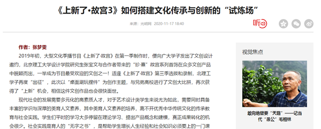 《上新了·故宫》这样的节目,凸显了社会实践育人与高校人才培养的融合,节目所提供的广阔舞台和资源支撑,让学生将理论知识转化为实际应用,不但让学生个人设计水平得到了充足试炼,更是推动了广大学生参与设计实践的热情,是个非常有利于学生成长成才的创意尝试,为学生走向社会架起一座桥梁。