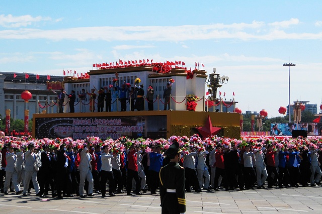 10 月1 日上午10 点,国庆60 周年庆典活动正式开始。光荣的时刻到了。11 点23 分,群众游行队伍开始接受检阅,由我校师生组成的二十二总队所组成的“民主政治”方阵全体队列成员以高昂的士气、饱满的热情接受了党和国家领导人、全国人民的检阅。
