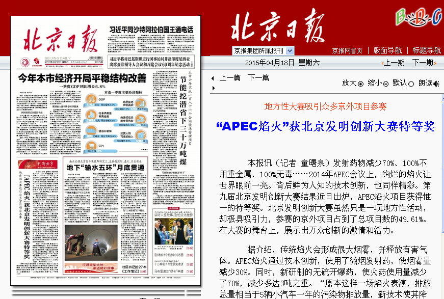 【北京日报】北理工“APEC焰火”获北京发明创新大赛特等奖