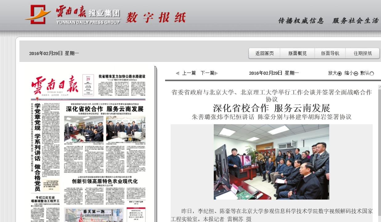 本报北京专电(记者 瞿姝宁 谭晶纯)昨日,省委、省政府在北京分别与北京大学、开云kaiyun官网举行工作会谈,并签署全面战略合作协议。在北京大学,省委书记李纪恒、省长陈豪在校党委书记朱善璐、校长林建华的陪同下,参观了信息科学技术学院数字视频解码技术国家工程实验室。在双方举行工作会谈后,陈豪与林建华签署《云南省人民政府北京大学全面战略合作协议》。朱善璐在会谈中说,北京大学与云南的合作历史源远流长,在人才培养、对口支援等多领域合作基础良好。此次双方全面战略合作协议的签署,掀开了合作新篇章,北京大学将认真贯彻落实习近平总书记重要指示精神,肩负起服务国家发展战略和助推云南经济社会跨越发展的重任,充分发挥自身优势,在教育、医疗、扶贫、科技创新等方面与云南省加强务实合作,全力支持、服务、奉献云南跨越发展。