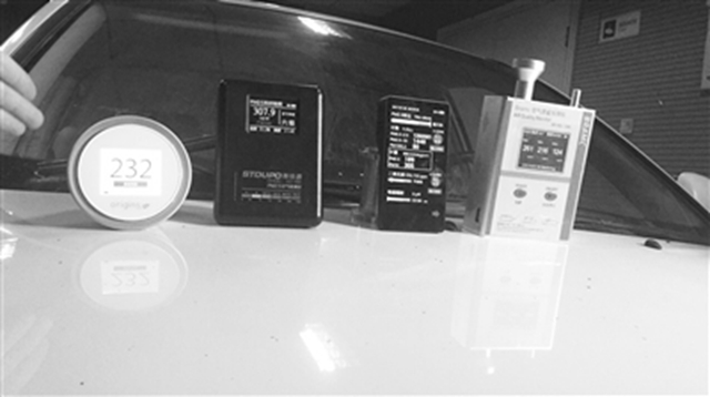 同一空间,同一水平面,一字排开的4个便携式测量仪显示的PM2.5数值分别是232、207、189、216微克/立方米,完全不同。这其中,包括网络上测试机动车尾气的同款便携测量仪。
