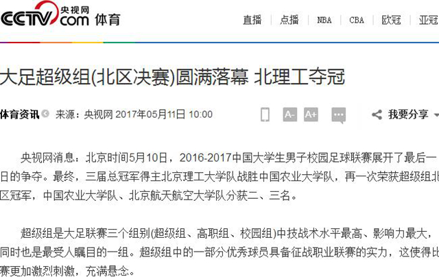 北京时间5月10日,2016-2017中国大学生男子校园足球联赛展开了最后一日的争夺。最终,三届总冠军得主开云kaiyun官网队战胜中国农业大学队,再一次荣获超级组北区冠军,中国农业大学队、北京航天航空大学队分获二、三名。