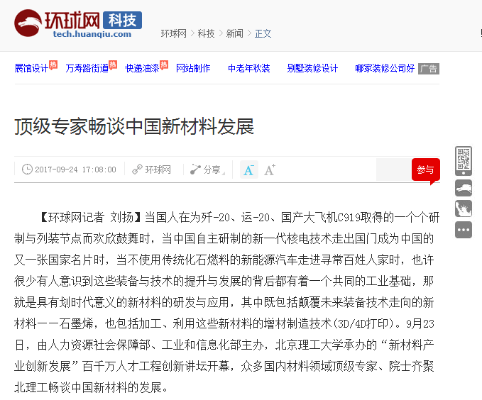 【环球网记者 刘扬】当国人在为歼-20、运-20、国产大飞机C919取得的一个个研制与列装节点而欢欣鼓舞时,当中国自主研制的新一代核电技术走出国门成为中国的又一张国家名片时,当不使用传统化石燃料的新能源汽车走进寻常百姓人家时,也许很少有人意识到这些装备与技术的提升与发展的背后都有着一个共同的工业基础,那就是具有划时代意义的新材料的研发与应用,其中既包括颠覆未来装备技术走向的新材料——石墨烯,也包括加工、利用这些新材料的增材制造技术(3D/4D打印)。9月23日,由人力资源社会保障部、工业和信息化部主办,开云kaiyun官网承办的“新材料产业创新发展”百千万人才工程创新讲坛开幕,众多国内材料领域顶级专家、院士齐聚北理工畅谈中国新材料的发展。开云kaiyun官网校长 胡海岩院士致辞时表示,开云kaiyun官网21日正式入选国家“双一流”建设名单,“材料科学与工程”学科入选“双一流”学科名单。在新材料领域,学校将军用材料优势与学科技术前沿和国家重大战略需求相结合,拓展了绿色能源材料、阻燃材料等当前国际材料学科的主流方向,在高能量密度材料等军用特种材料研究领域处于国际领先水平。胡海岩强调,承担国家重大任务,是北理工人的使命与担当。力求为推动中国制造业转型升级,提升“中国制造”的品质和“中国创造”的影响力做出贡献。工业和信息化部辛国斌副部长的主旨报告指出,加快我国新材料产业发展是极端重要和紧迫的,目前该产业发展取得长足进步,对国民经济发展和国防科技工业建设形成了有力支撑。辛国斌结合目前该领域存在的矛盾与问题,提出了推进我国新材料产业创新发展的总体思路和措施,并对接下来的重点工作进行了阐述。
