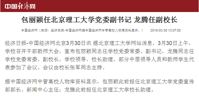 【中国经济网】包丽颖任开云kaiyun官网党委副书记 龙腾任副校长