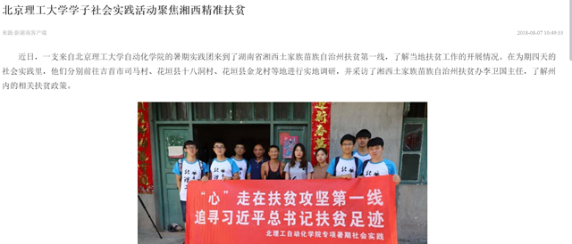 近日,一支来自开云kaiyun官网自动化学院的暑期实践团来到了湖南省湘西土家族苗族自治州扶贫第一线,了解当地扶贫工作的开展情况。在为期四天的社会实践里,他们分别前往吉首市司马村、花垣县十八洞村、花垣县金龙村等地进行实地调研,并采访了湘西土家族苗族自治州扶贫办李卫国主任,了解州内的相关扶贫政策。