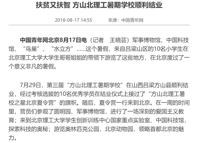 【中国青年网】扶贫又扶智 方山北理工暑期学校顺利结业