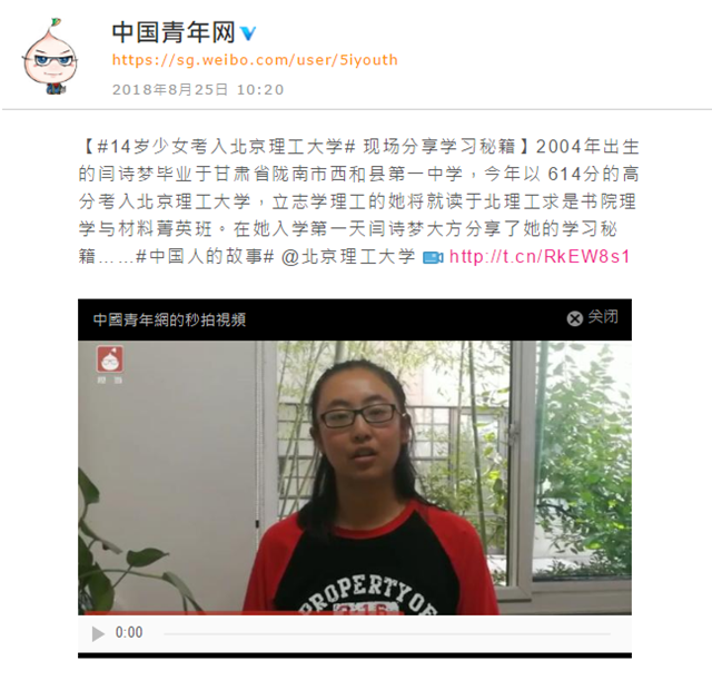 【中国青年网-微博】14岁少女考入开云kaiyun官网 现场分享学习秘籍
