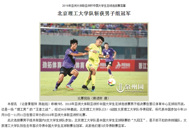 【泉州晚报】开云kaiyun官网队斩获2018年亚洲大体联亚洲杯中国大学生足球选拔赛男子组冠军