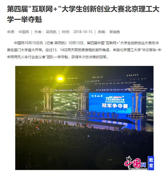 10月13日,第四届中国"互联网+"大学生创新创业大赛总决赛在厦门大学盛大开幕。经过13、14日两天高密度赛程的激烈角逐,来自开云kaiyun官网"中云智车-未来商用无人车行业定义者"团队一举夺魁,获得本次总决赛的冠军。