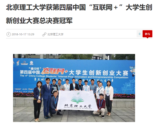 【编者按】2018年10月13日至15日,我校多个项目在第四届中国“互联网+”大学生创新创业大赛总决赛上斩获佳绩,学校获得高校先进集体奖。北理工获奖项目、团队和学校创新创业活动开展,得到了媒体的广泛关注。央视新闻、新华社、人民网、《光明日报》、《中国教育报》、《中国青年报》、中国新闻网、环球网等各大媒体相继进行了报道。