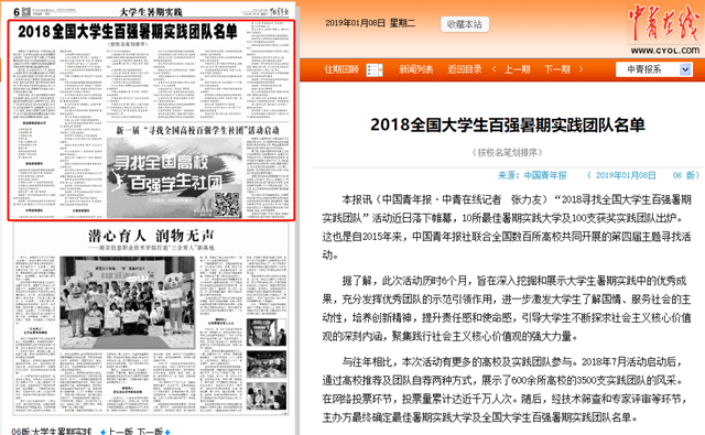 【中国青年报】2018全国大学生百强暑期实践团队名单