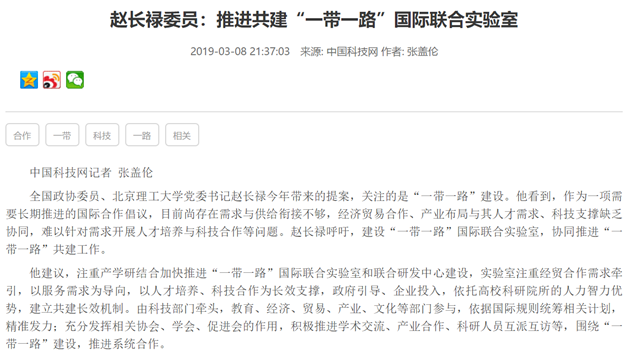 【两会▪中国科技网】赵长禄委员:推进共建“一带一路”国际联合实验室