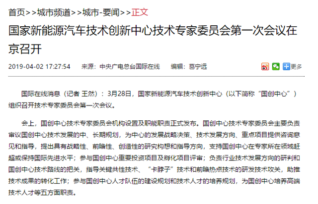 【央广国际在线】国家新能源汽车技术创新中心技术专家委员会第一次会议在京召开