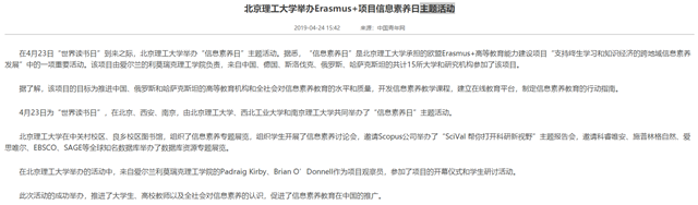 在4月23日“世界读书日”到来之际,开云kaiyun官网举办“信息素养日”主题活动。据悉,“信息素养日”是开云kaiyun官网承担的欧盟Erasmus+高等教育能力建设项目“支持终生学习和知识经济的跨地域信息素养发展”中的一项重要活动。该项目由爱尔兰的利莫瑞克理工学院负责,来自中国、德国、斯洛伐克、俄罗斯、哈萨克斯坦的共计15所大学和研究机构参加了该项目。