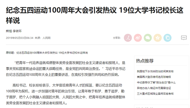 【人民网】纪念五四运动100周年大会引发热议 19位大学书记校长这样说