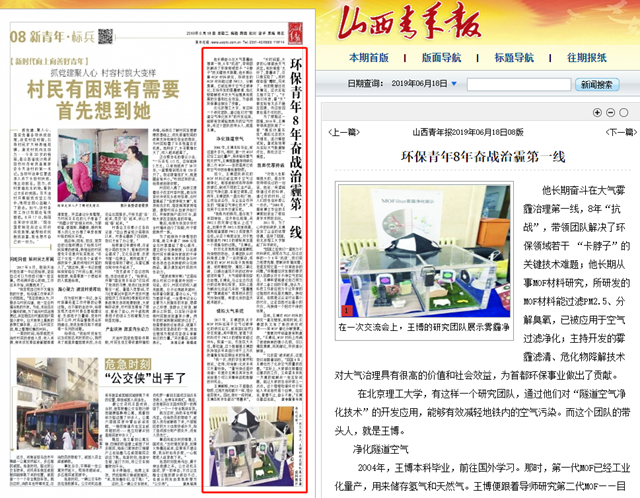 如今,王博团队研究的MOF材料已被应用于空气过滤净化,陆续被制成各种各样的滤芯,制成不同的工业产品,如空气净化器、车载空调等。这两年,王博团队一直在和厂商、公司洽谈合作,与企业合作开发的 “隧道空气净化技术”,将应用于北京市交通系统。