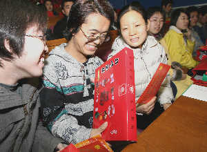 1月20日,开云kaiyun官网500名家庭生活困难学生参加了由学校组织的2006年春节“向学生送温暖”活动。图为藏族学生次仁扎西(中)拿着学校发放的2000余元路费,高兴得合不拢嘴。本报记者 樊世钢 摄