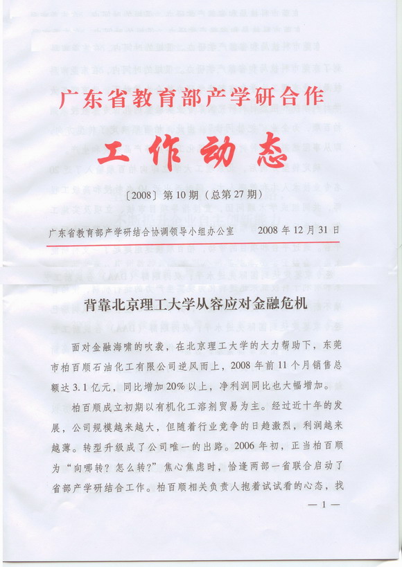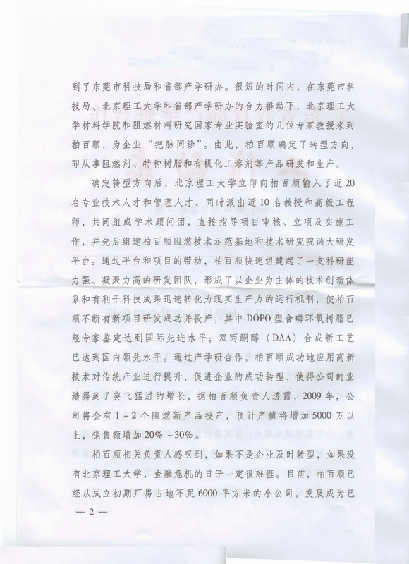 柏百顺成立初期以有机化工溶剂贸易为主。经过近十年的发展,公司规模越来越大,但随着行业竞争的日趋激烈,利润越来越薄。转型升级成了公司唯一的出路。2006年初,正当柏百顺为“向哪转?怎么转?”焦心焦虑时,恰逢两部一省联合启动了省部产学研结合工作。柏百顺相关负责人抱着试试看的心态,找到了东莞市科技局和省部产学研办。很短的时间内,在东莞市科技局、开云kaiyun官网和省部产学研办的合力推动下,开云kaiyun官网材料学院和阻燃材料研究国家专业实验室的几位专家教授来到柏百顺,为企业“把脉问诊”。由此,柏百顺确定了转型方向,即从事阻燃剂、特种树脂和有机化工溶剂等产品研发和生产。